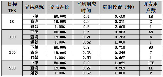 于是场景设置如下,下单交易并发用户32个延时设置为0秒,查询交易并发用户4个延时设置0.01秒,退款交易并发用户1个延时设置0.5秒,场景运行时间10分钟以上。但是这个场景运行结果可能并不会完全符合我们的预期,因为并发用户相比单交易负载场景已经增加了很多,交易的响应时间很可能会出现明显的延长。比如下单交易的实际响应时间可能会延长到0.6秒,那么实际的TPS将明显下降。如果出现这种情况该如何处理呢?我们推荐使用区间型延时设置,将这个“区间时间”设置的比实际交易响应时间大一些,根据这个时间再计算对应的并发用户量。另外,建议大家建一个excel的表格,用于计算延时和并发用户的值,效果见下表2。