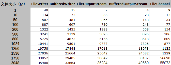 表1、java各种文件写入方法效率对比实验时延数据表