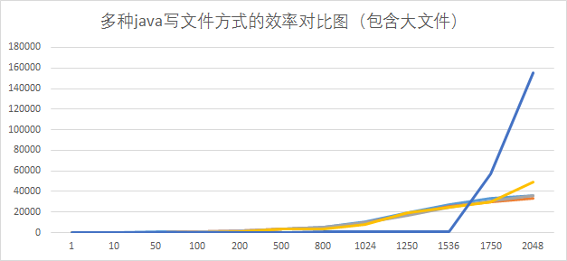 表1、java各种文件写入方法效率对比实验时延结果图(含大文件)