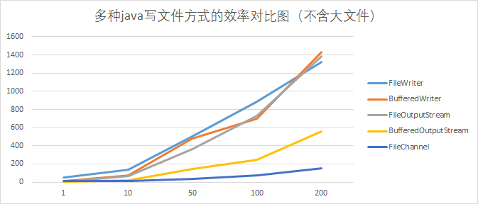1、基本上,五种写入方式的时延从小到大排序为:FileChannel<BufferedOutputStream<FileOutputStream<BufferedWriter<FileWriter;从表1、图1;可以看出;且该规律在小文件写入的情景下,更为明显,图2可以看出;