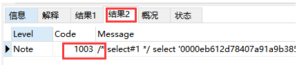 结果2里面显示code=1003.后面有个sql语句。这个语句是mysql把我们输入的sql语句,按照规则改写之后执行的终语句。