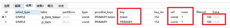 其中表 p_item_token 中 itemid 是主键, token 是索引。 p_item 中itemid 是主键