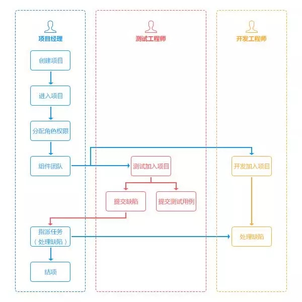 项目经理创建项目、组建团队、分配权限,相关职责人提交缺陷、处理缺陷,协助企业更好的进行测试项目的缺陷管理。