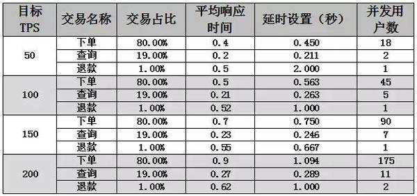 于是场景设置如下,下单交易并发用户32个延时设置为0秒,查询交易并发用户4个延时设置0.01秒,退款交易并发用户1个延时设置0.5秒,场景运行时间10分钟以上。但是这个场景运行结果可能并不会完全符合我们的预期,因为并发用户相比单交易负载场景已经增加了很多,交易的响应时间很可能会出现明显的延长。比如下单交易的实际响应时间可能会延长到0.6秒,那么实际的TPS将明显下降。如果出现这种情况该如何处理呢?我们推荐使用区间型延时设置,将这个“区间时间”设置的比实际交易响应时间大一些,根据这个时间再计算对应的并发用户量。另外,建议大家建一个excel的表格,用于计算延时和并发用户的值,效果见下表2。