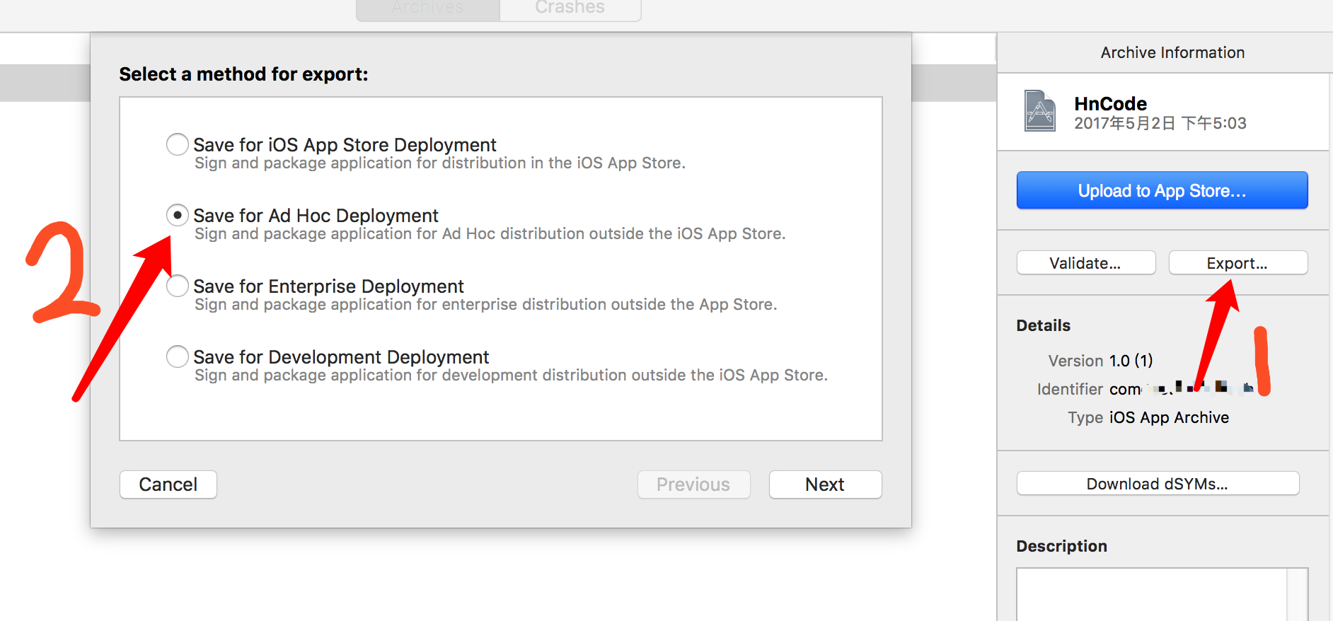打包也简单,使用xcode自带的打包行,不过打包前要选择证书什么的,(其实跟发布到App Store一样的流程)。注意的一个地方我用图来表示吧: