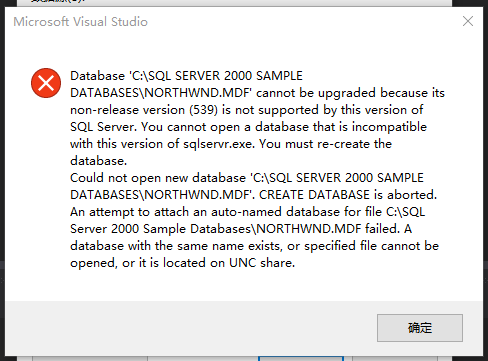 在使用VS2017时,需要导入一些mdf文件,比如微软的Northwind,在导入时系统会提示:
