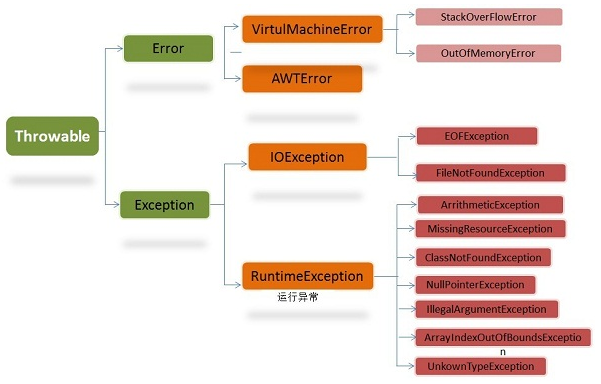 非运行时异常 (编译异常):是RuntimeException以外的异常,类型上都属于Exception类及其子类。从程序语法角度讲是必须进行处理的异常,如果不处理,程序不能编译通过。如IOException、SQLException等以及用户自定义的Exception异常,一般情况下不自定义检查异常。