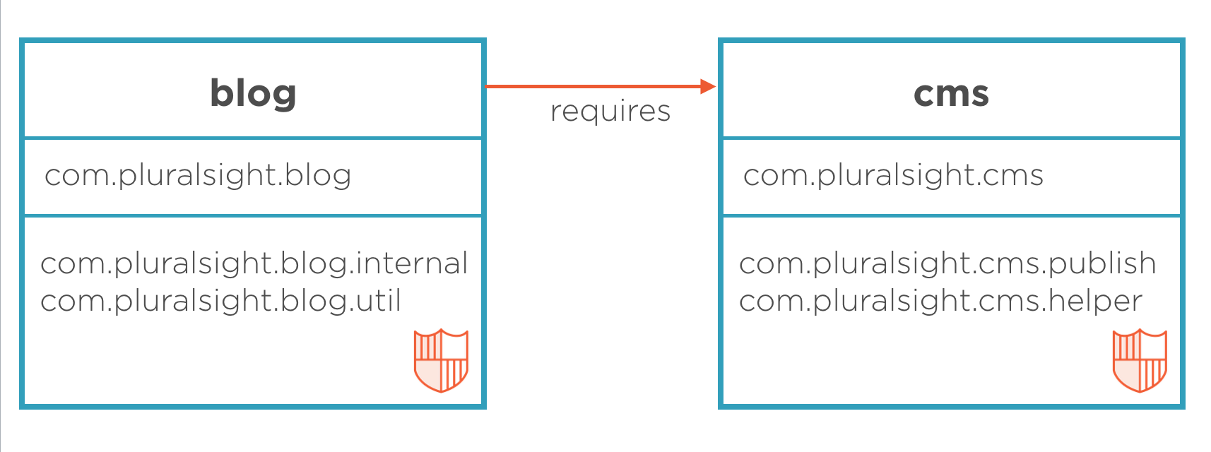 请注意,两个模块都包含封装的包,因为它们没有被导出(使用橙色盾牌可视化)。 没有人会偶然地使用来自这些包中的类。Java 平台本身也使用自己的模块系统进行了模块化。通过封装 JDK 的内部类,平台更安全,持续改进也更容易。