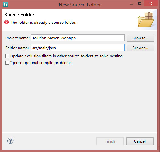 可是,当我们创建“src/main/java”或“src/test/java”时,会提示“The folder is already a source folder.”如下图所示: