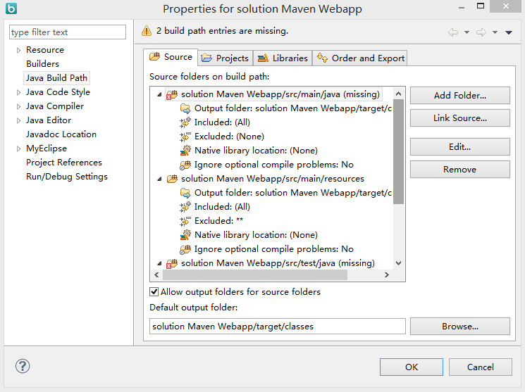 项目上【右键】,选择【Properties】,点击【Java Build Path】,在Source选项卡中可以看到,“/src/main/java”和“/src/test/java”为missing状态,如下图所示: