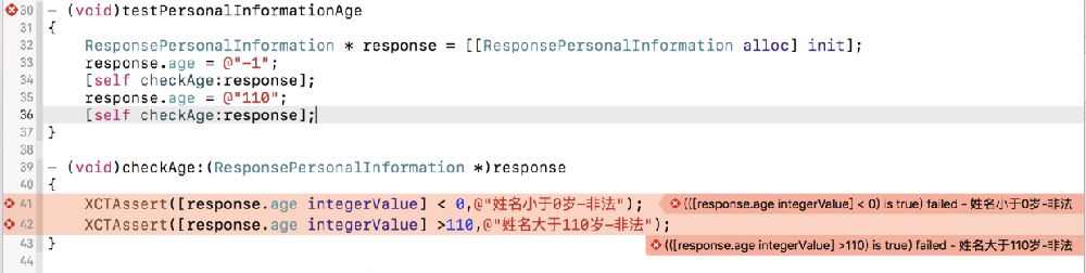 /Users/xl10014/Desktop/单元测试demo/单元测试demoTests/PersonalInformationTests.m:45: error: -[PersonalInformationTests testPersonalInformationAge] : (([response.age integerValue] < 0) is true) failed - 姓名小于0岁-非法 //这里说明用例错误 并且定位到 文件具体行数 PersonalInformationTests.m:45行