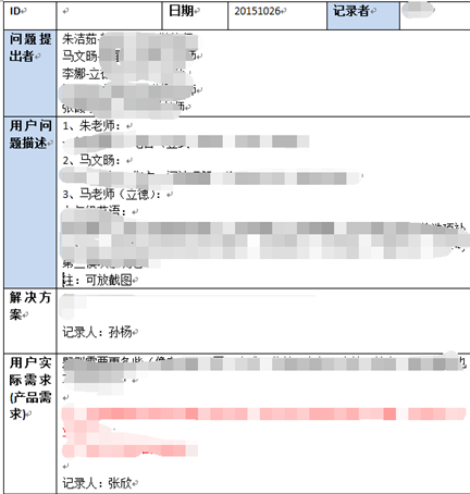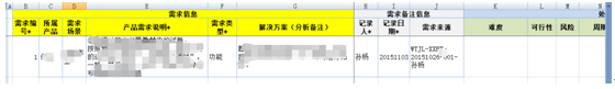 以上的“问题提出者”和“用户问题描述”用于记录用户提出的问题,问题经过我们的分析记录在“解决方案”中,描述如何解决用户的问题,后进一步分析出问题所代表的“用户实际需求”。这个“用户实际需求”是终要记录在《产品需求列表》中的需求。