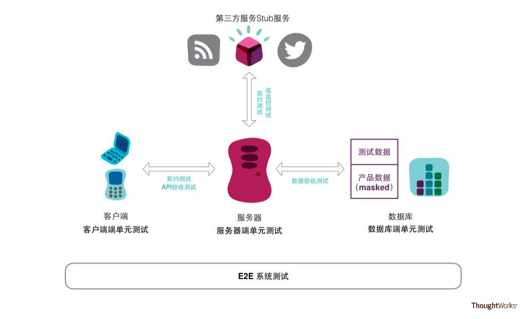 首先,前端、后端API、第三方依赖系统和数据库系统有各自的单元测试、集成测试等,然后可以使用契约测试来测试统一前端和后端API,再使用Stub加入对于第三方依赖系统的契约测试或者监控测试,还需要使用测试数据生成系统参数,将各种测试数据存入数据库系统用于支持契约测试等。