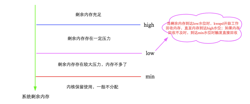 简单来说,Linux会在两种场景下触发内存回收,一种是在内存分配时发现没有足够空闲内存时会立刻触发内存回收;一种是开启了一个守护进程(swapd进程)周期性对系统内存进行检查,在可用内存降低到特定阈值之后主动触发内存回收。第一种场景没什么可说,来重点聊聊第二种场景,如下图所示: