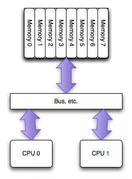 NUMA(Non-Uniform Memory Access)是相对UMA来说的,两者都是CPU的设计架构,早期CPU设计为UMA结构,如下图(图片来自网络)所示: