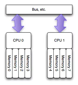 为了缓解多核CPU读取同一块内存所遇到的通道瓶颈问题,芯片工程师又设计了NUMA结构,如下图(图片来自网络)所示: