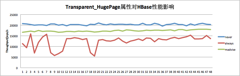 如上图,TPH关闭场景下(never)HBase性能优,比较稳定。而THP开启的场景(always),性能相比关闭的场景有30%左右的下降,而且曲线抖动很大。可见,HBase线上切记要关闭THP。