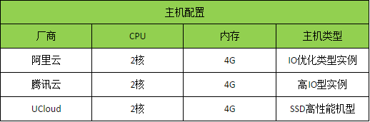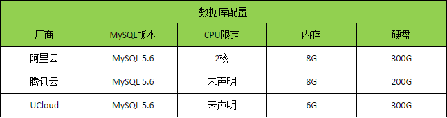 因此我选择的数据库配置如下:硬盘 300GB SSD,内存 8GB 左右。由于每个云平台提供的配置都不相同(腾讯云的内存和磁盘比例是限定的,UCloud 的内存没有 8G 等等),我在三个云平台上分别申请了如下配置的云数据库进行性能测试: