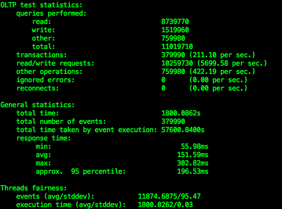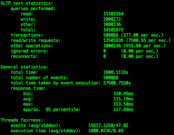 同时,对于写操作,稍微提高了 update 操作的比例。终运行的测试中,每一个事务的读操作和写操作的比例是 6:1 左右。为了模拟项目启动之后的场景,我的 sysbench 测试集的数据量是总共 20 张表,每张表 200 万行数据,开启 32 个线程,并行向数据库发送事务请求,共运行 30 分钟。下面是我观察到的结果:
