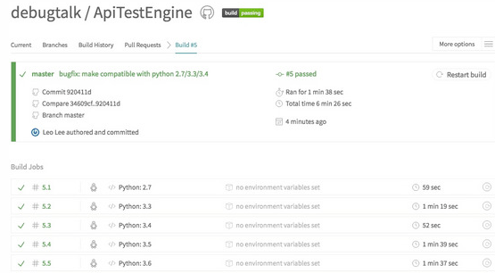 配置完毕后,后续每次提交代码时,GitHub会调用Travis CI实现构建检查;并且更赞的在于,构建检查可以同时在多个指定的Python版本环境中进行。