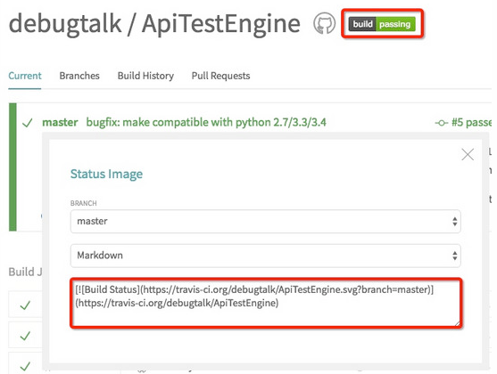 配置方式也是很简单,只需要先在Travis CI中获取到项目Status Image的URL地址,然后添加到README.md即可。