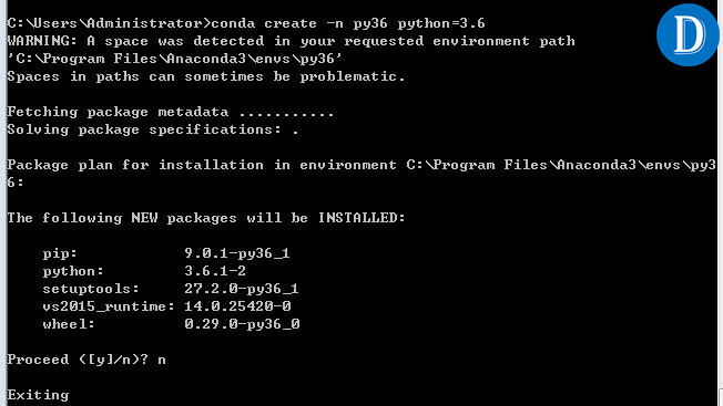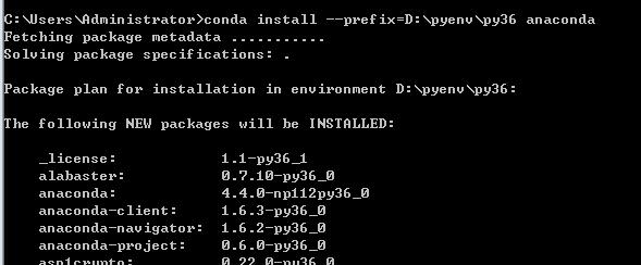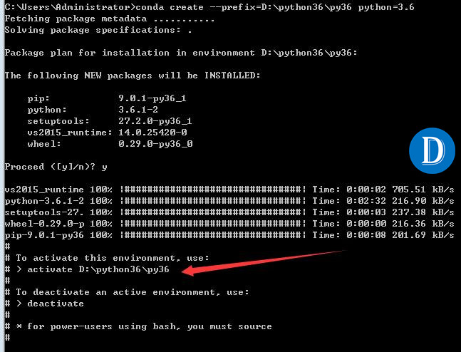 上面的命令中, 路径D:python36是先建好的文件夹,py36是需要安装的虚拟环境名称。请注意,安装完成后,虚拟环境的全称包含整个路径,为D:python36py36。激活指定路径下的虚拟环境的命令如下: