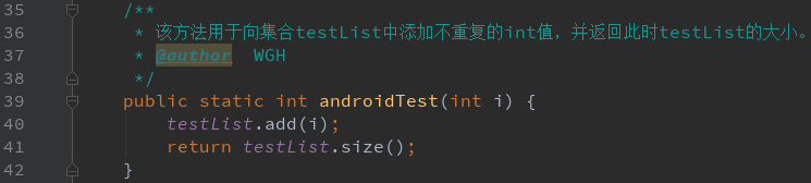 首先在 MainActivity 中编写 androidTest() 方法,该方法用于向集合 testList 中添加不重复的 int 值,并返回此时 testList 的大小: