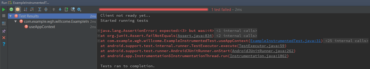 很遗憾,测试用例没有通过。从这个测试用例中我们发现, androidTest() 方法中的代码原来是不够健壮的,这个时候应该对代码进行优化了。