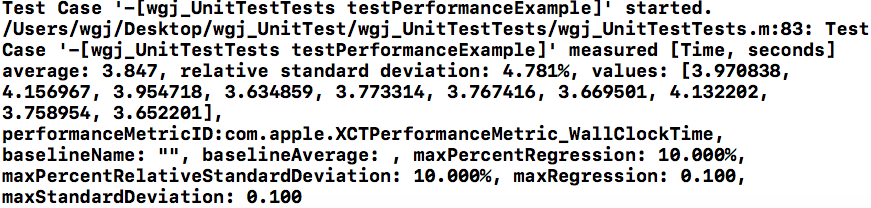 4.(void)testPerformanceExample{//会将方法中的block代码耗费时长打印出来--默认执行了10次,打印出了平均耗时,和各次的耗时,大误差不超过10%。其中运行之后block这行右侧显示的是平均耗时。