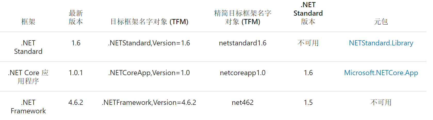 其主要目的是规范 .net 不同运行时下的框架,提出一套可以通用的api标准。先来看看当前微软官方框架以及当前版本的详细信息: