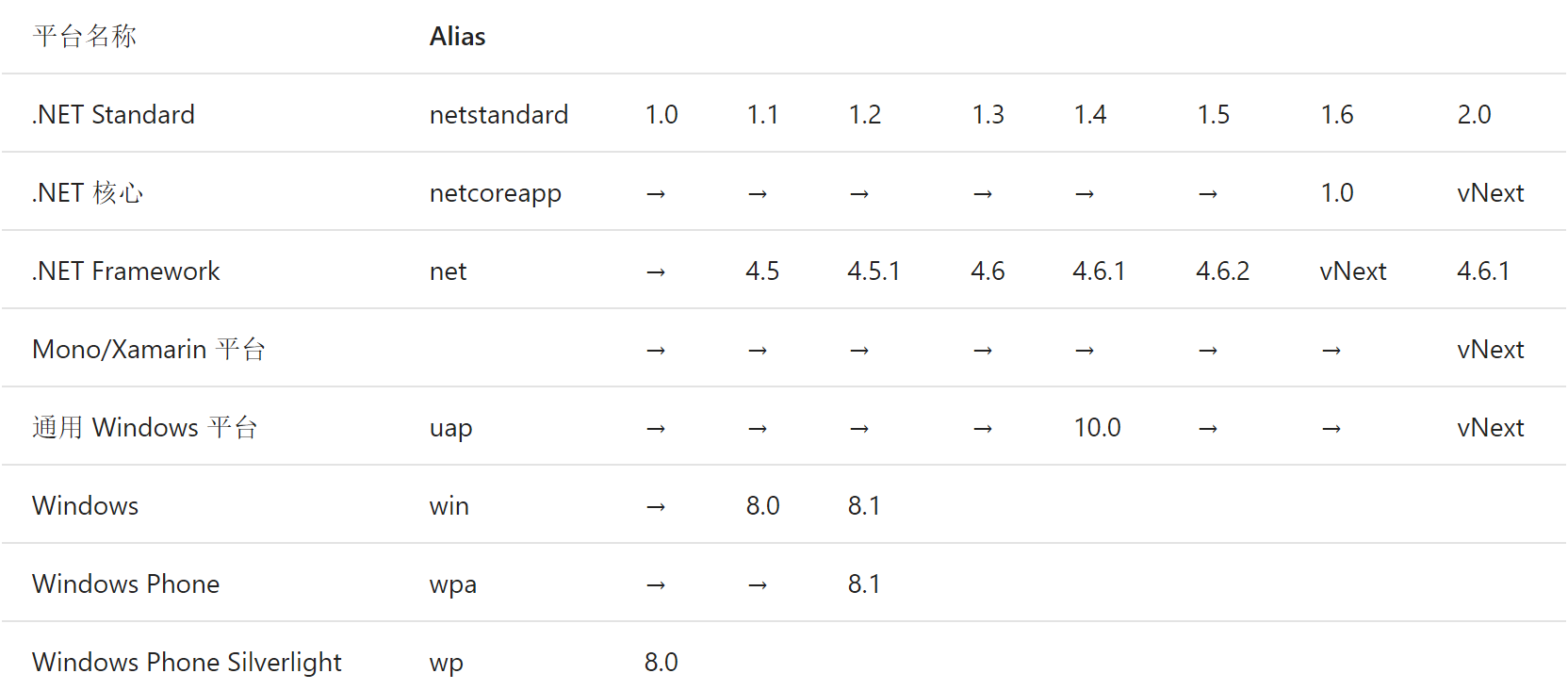 也是其他框架可以实现自己的特性,但同时也要实现对应的.net standard框架api,那么可以在有需求的框架类库中直接使用对应版本的.net standard框架的类库。下边给出.net standard和其他框架(图中叫平台)的版本对照关系:
