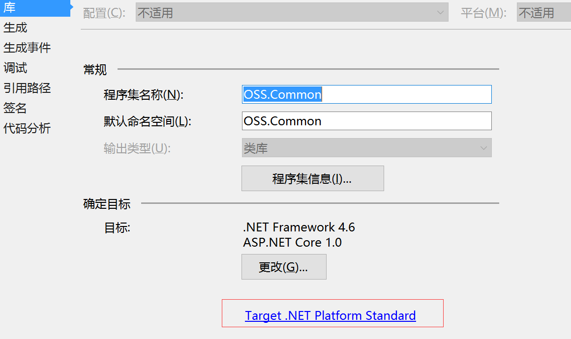 2. 使用标准库或者可移植类库,这个比较简单,只是vs2017才支持直接创建标准库项目,如果在2015中有需要可以先创建可移植项目,去属性页修改目标即可,如图: