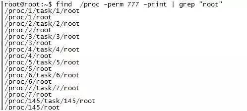 例2.在proc目录下查找权限为777且带有“root”的文件且输出;