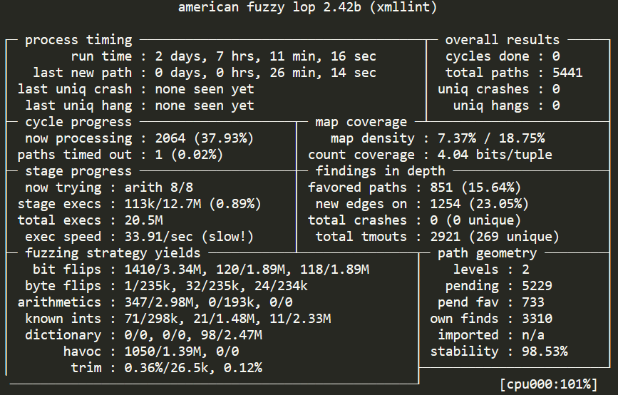 我们的第一次运行并没有按预期的那样进行。2天7小时后,我们发现了大文件使用确定性模糊测试的缺点。我们的 afl-cmin小化语料库包含了一些超过100kB的样本,导致AFL在加工之后减慢了运行速度,仅次于第一轮的38%。AFL需要几天的时间才能通过单个文件,我们在样本集中有四个,所以我们决定在我们删除超过10kB的样本后重新启动实例。可悲的是,星期天晚上11点,“备份第一”不是我们头脑中的第一件事,AFL的数据被意外覆盖,所以没有第一个比较的结果。我们设法在中止之前保存AFL UI。
