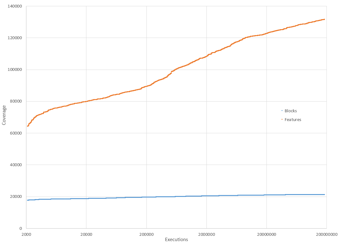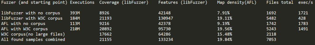 我们实际上从来没有试图把这些fuzzer相互对抗。即使在我们的实验中,这两个fuzzer结果都是惊人的。从W3C样本开始,由libFuzzer测量的发现覆盖率之间的差异只有1.4%。同时这两个fuzzer都发现了几乎相同的覆盖。当我们合并了四个运行的所有收集的文件和原始的W3C样本时,组合覆盖率仅比libFuzzer单独发现的覆盖率高出1.5%。另一个值得注意的是,即使在2天之后,没有初始样本,libFuzzer或AFL都没有发现比以前的演示更多的覆盖率,在10分钟内反复产生了一个语料库。