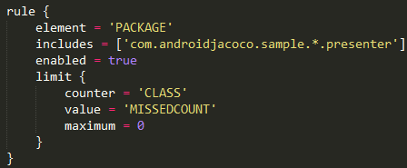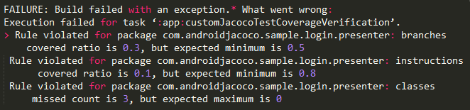 这个 task 依赖于前面的 customJacocoTestReport task,如果执行它,将会首先生成测试覆盖报告然后接着对其进行分析。这个 task 的配置中包含如何找到源代码类所在的路径,以及 violationRules 配置块。violationRules 配置块本身又包含了一些规则块,只要你愿意,你可以添加尽可能多的这种规则块。在这个例子中,我配置了三个规则块:
