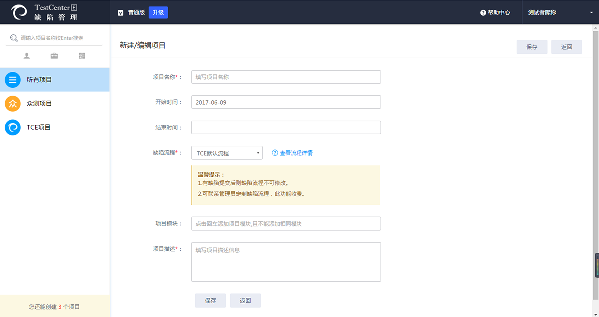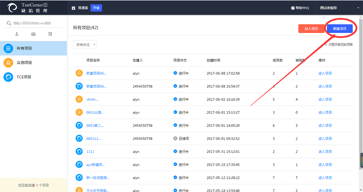 3. 回到项目列表,用户点击【新建项目】按钮新建一个TCE项目。