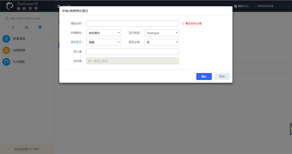 所属模块:自定义属性所属的模块,目前TCE支持添加缺陷属性及用例属性两类。