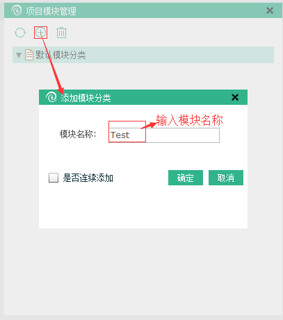 【新增模块】按钮,弹出添加模块分类对话框,输入模块名称:Test,点击【确定】按钮,为项目新增一个模块