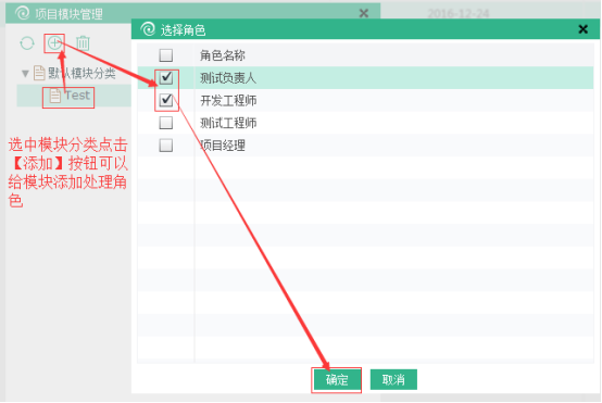 【分配角色】按钮,弹出角色选择框。角色列表的角色是根据项目中配置的角色组中的角色进行展示的。勾选一个或者多个角色,点击【确定】按钮,为模块分配处理角色