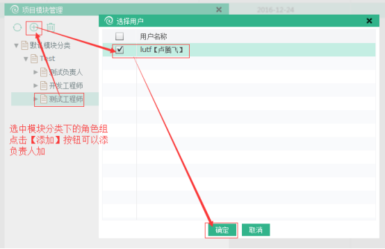 【添加用户】按钮,弹出用户选择对话框,列表内的用户都是和角色节点对应的用户。勾选一个或者多个用户,点击【确定】按钮,可以为模块分配负责人。