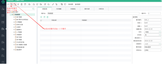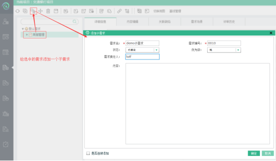 【添加子需求】按钮,为选中的需求节点:商服管理,依次输入需求名:demo子需求、需求编号:0010、点击