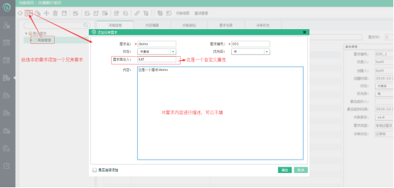 【添加兄弟需求】按钮,为选中的需求节点:商服管理,依次输入需求名:demo、需求编号:001、点击