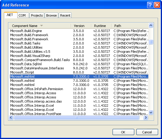 mshtml.dll的COM组件名字叫"Microsoft.mshtml", 添加引用如下Add References-> .NET Tab->Microsoft.mshtml