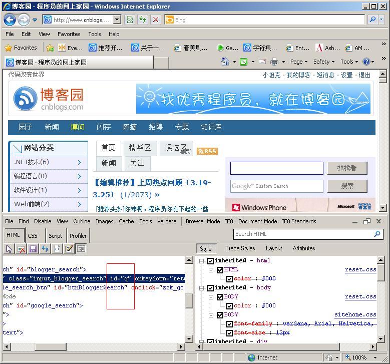 从图中可以看到博客园中的搜索textbox的id是"q"