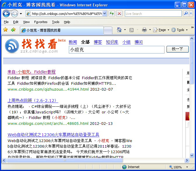 模拟一个在博客园首页进行搜索的场景。 模拟在文本框中输入数据, 然后点击"找找看按钮"。