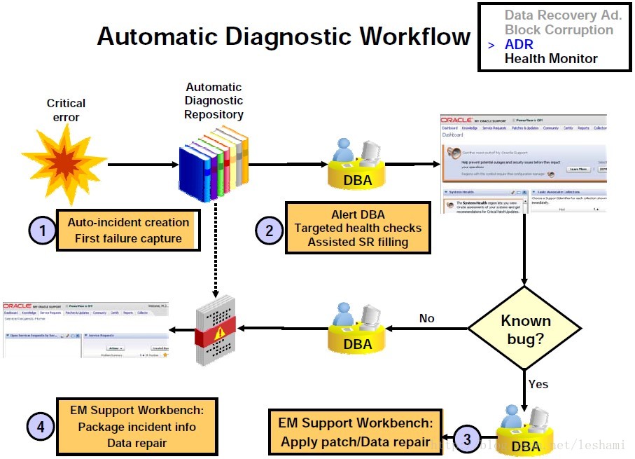 一个永远在线的内存中跟踪功能使数据库组件能够在第一时间捕获诊断数据首次出现严重错误。并将其相关信息存储到Automatic Diagnostic Repository。此信息可用于创建要发送到Oracle Support Services进行调查的事件包。以下是诊断会话的典型工作流程: