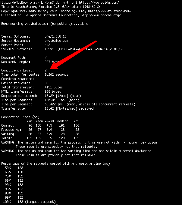 Time per request=Time taken for tests/(Complete requests/Concurrency Level)