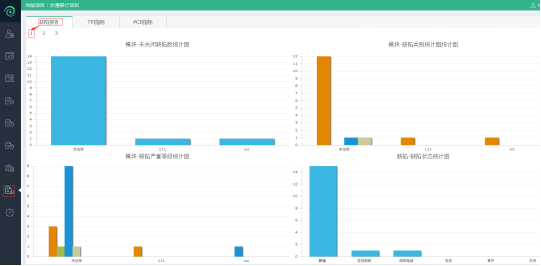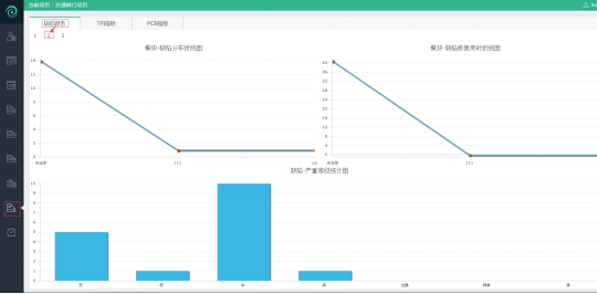 2) 显示模块-缺陷分布折线图、模块-缺陷修复用时折线图、缺陷严重等级统计图