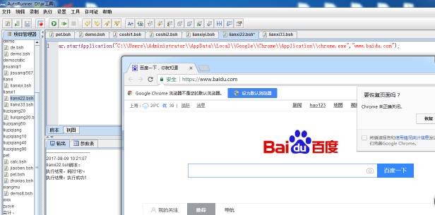 ar.startApplication("C:\Users\Administrator\AppData\Local\Google\Chrome\Application\chrome.exe","www.baidu.com");然后执行下脚本,发现可以自动打开谷歌浏览器,进入百度页面!